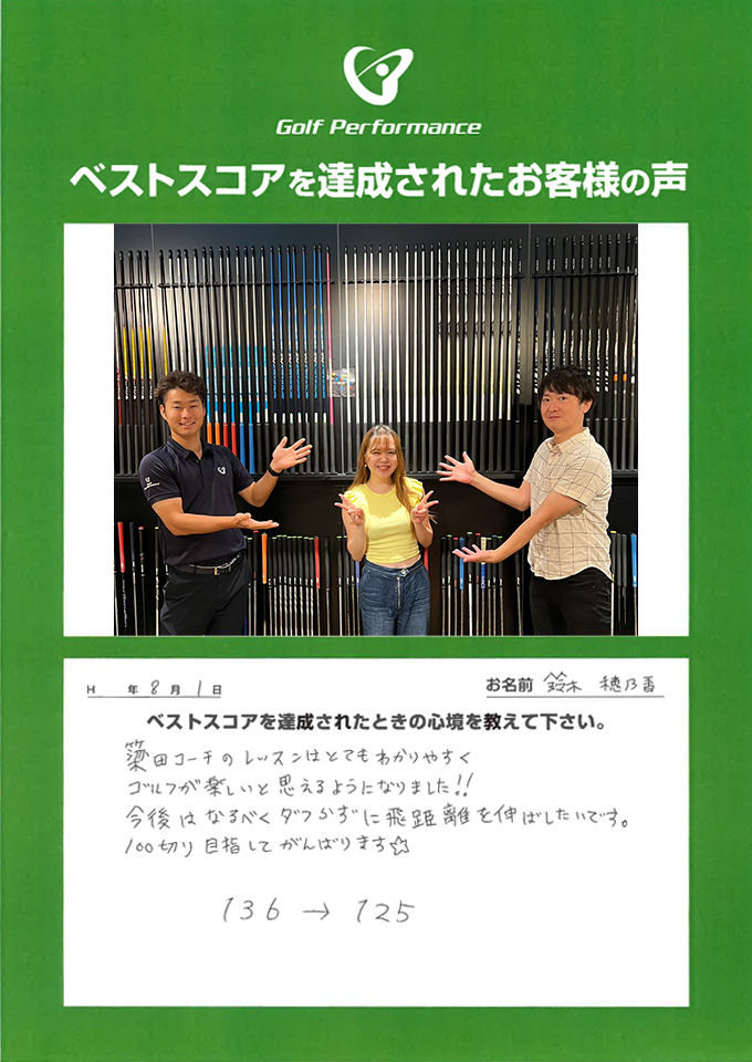 鈴木穂乃香様 達成日:7/28 入会時のベストスコ…続きを読む